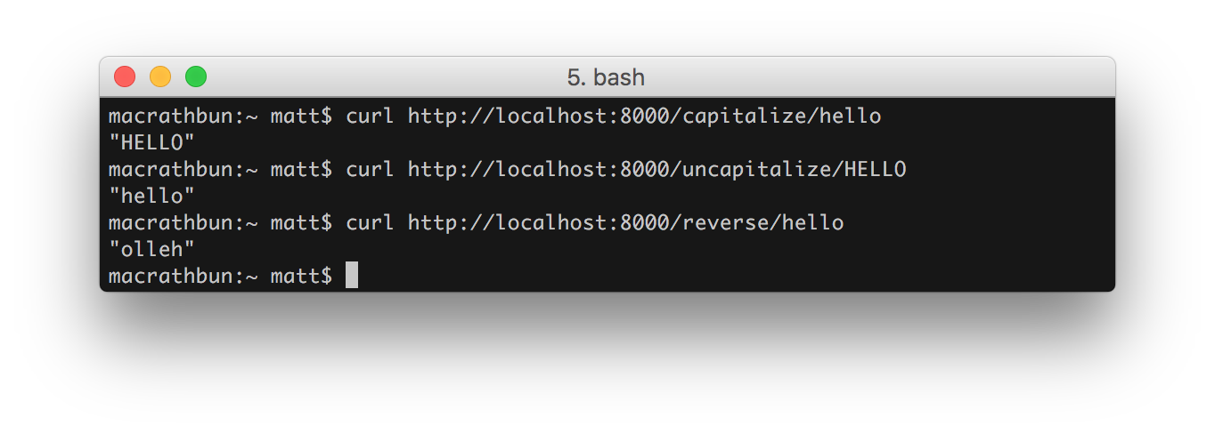 To try this out, my goal was to write an API where the endpoints would all be written in different languages. I chose to write something very simple with three endpoints: