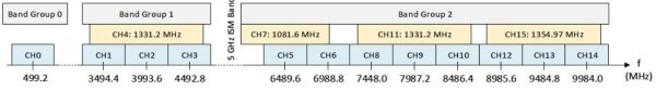 Eventually, in 2002, the FCC, after extensive study, allocated 7.5GHz of spectrum for unlicensed, commercial UWB purposes, specifying strict power and emission limits. Below is the UWB spectrum; the blue channels have a 500MHz bandwidth while the yellow channels have much more bandwidth[5].